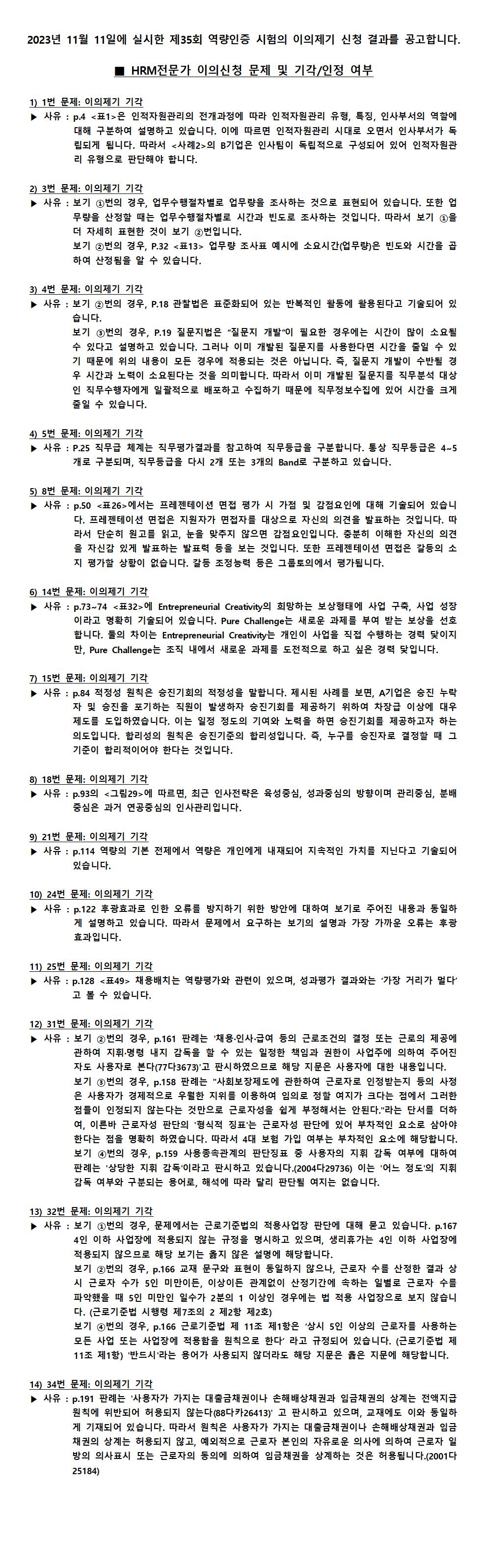 제35회 역량인증 시험 HRM전문가 이의제기 결과 공고