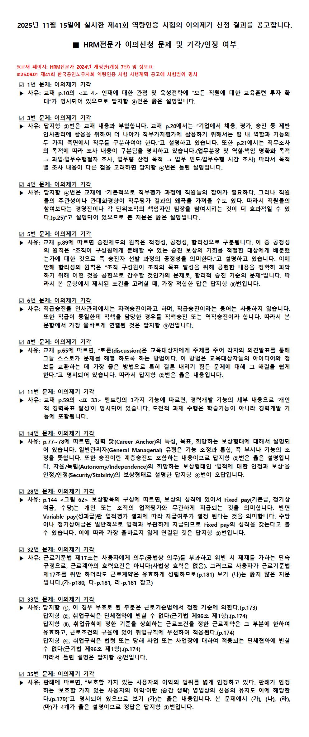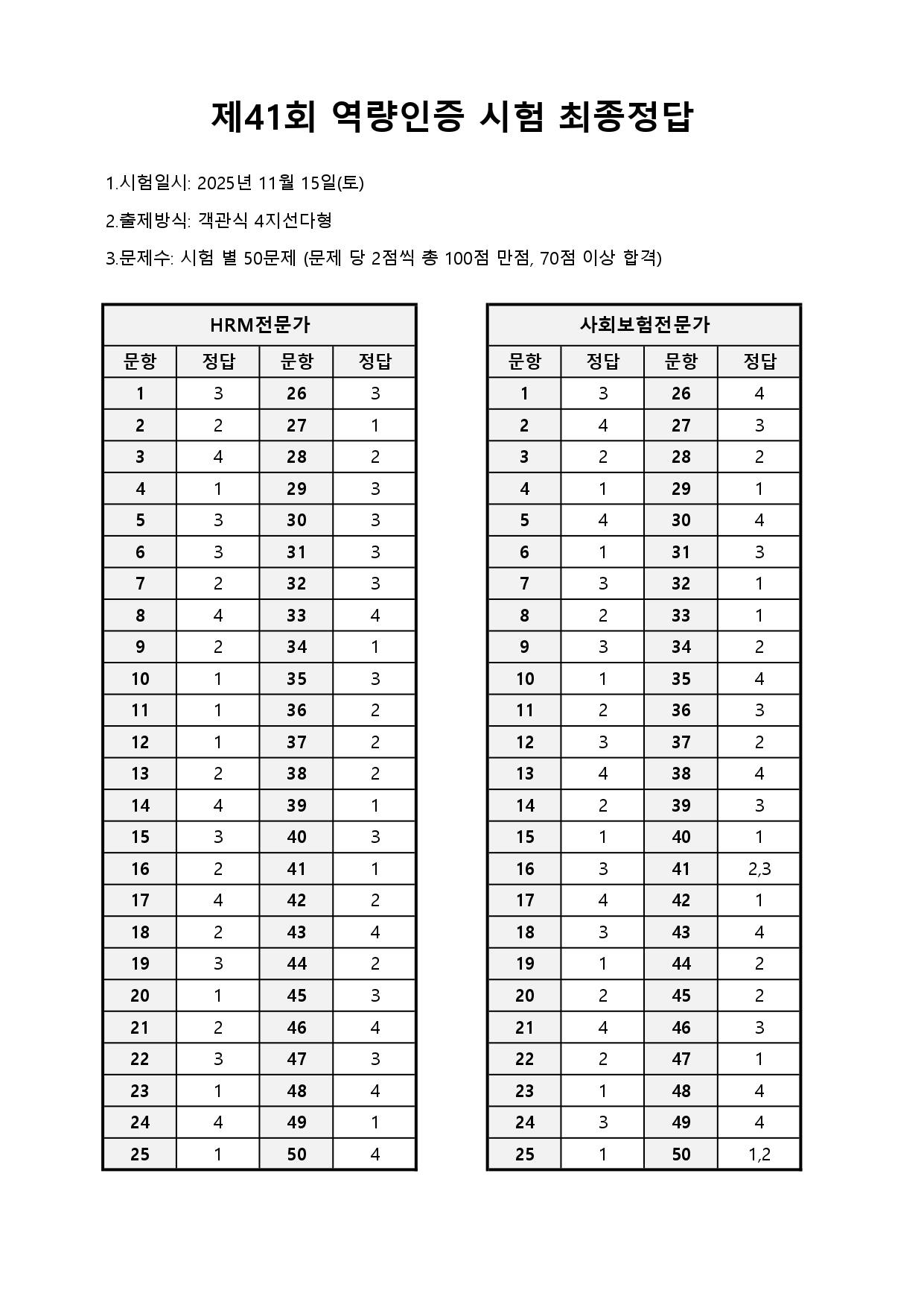 제41회 역량인증 (HRM전문가/사회보험전문가) 최종정답 및 이의제기 결과 공고
